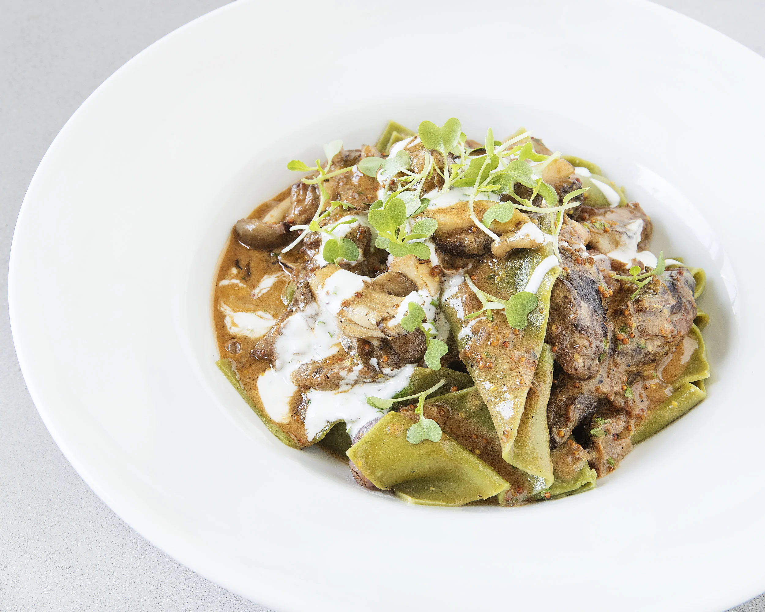 As mentioned previously, Olea pays homage to its predecessors, weaving a few menu offerings from Vine and Ironwood into the mix. These are perennial favorites such as the Crispy Meyer Lemon & Honey Duck Wings and the Jidori Chicken Schnitzel. Our own foray started with a rich terrine of duck liver, bourbon and bacon accompanied by smoky pain grille, as well as a crudité platter, which was a nice, lighter alternative to the meat and cheese board and featured house-pickled vegetables. These items were followed by a few additional appetizers that were amazing - baked oysters topped with blue crab, some sweet and savory garnet yam agnolotti, as well as the mushroom salad. Each of these were executed nicely, with the oysters being my favorite – rich crab meat and champagne tarragon butter juxtaposed to the briny bite of the oysters make this a worthwhile indulgence.
