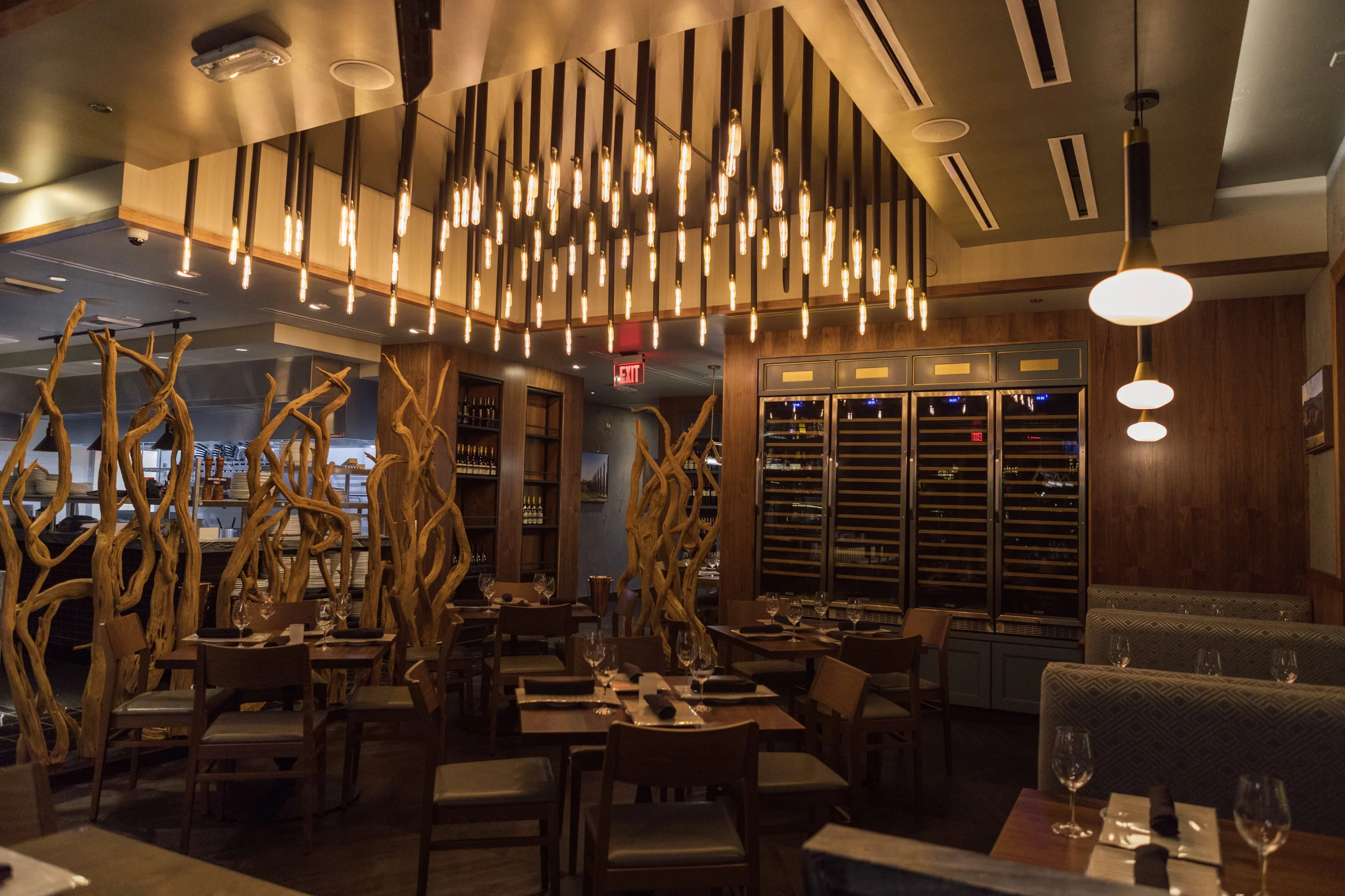 Counterpoint to the organic elements are clean lines and distressed metal that layer in industrial look, as well as a custom lighting feature that finishes the dining area off with a modern flair.